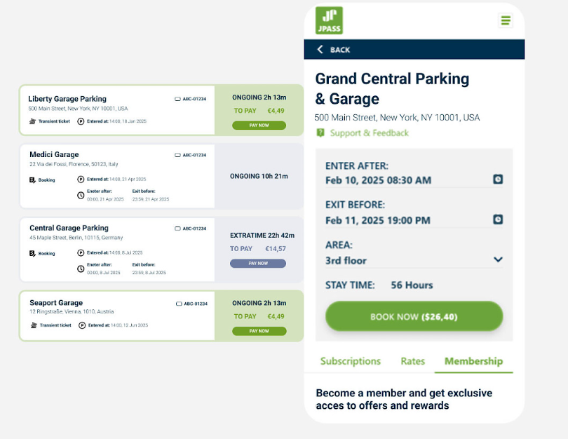 Οι χρήστες μπορούν να αναζητήσουν ανεξάρτητα, να κάνουν κράτηση, να πληρώσουν για μια θέση εκ των προτέρων και να ενημερώσουν την κράτησή τους για πάρκινγκ μέσω του JPass για κινητά (iOS και Android) ή στο διαδίκτυο. Στις εγκαταστάσεις, το JPass λειτουργεί ως μέσο πρόσβασης, βασιζόμενο στην τεχνολογία Bluetooth που είναι ενσωματωμένη στα περιφερειακά στάθμευσης ή στην ανάγνωση κωδικών QR στο μηχάνημα εισόδου, σε πλήρως ανέπαφη λειτουργία.